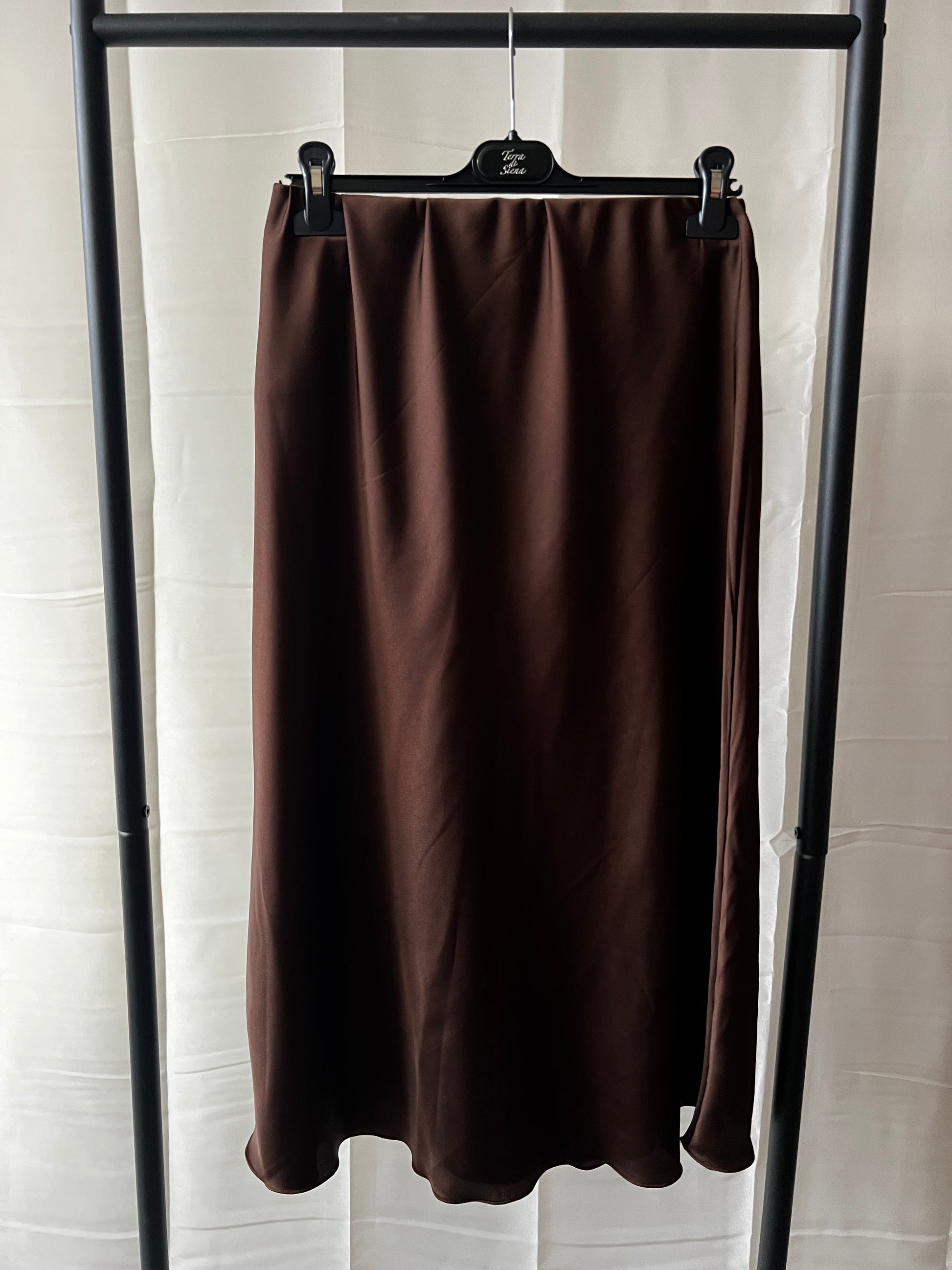 Jupe sophistiquée en satin marron, au drapé luxueux qui capte magnifiquement la lumière. Sa finition lisse et brillante rehausse toute tenue d'une élégance raffinée, tandis que sa coupe fluide assure une grande liberté de mouvement. Une pièce raffinée, conçue pour celles qui apprécient les matières de qualité et le luxe discret dans leur garde-robe.
