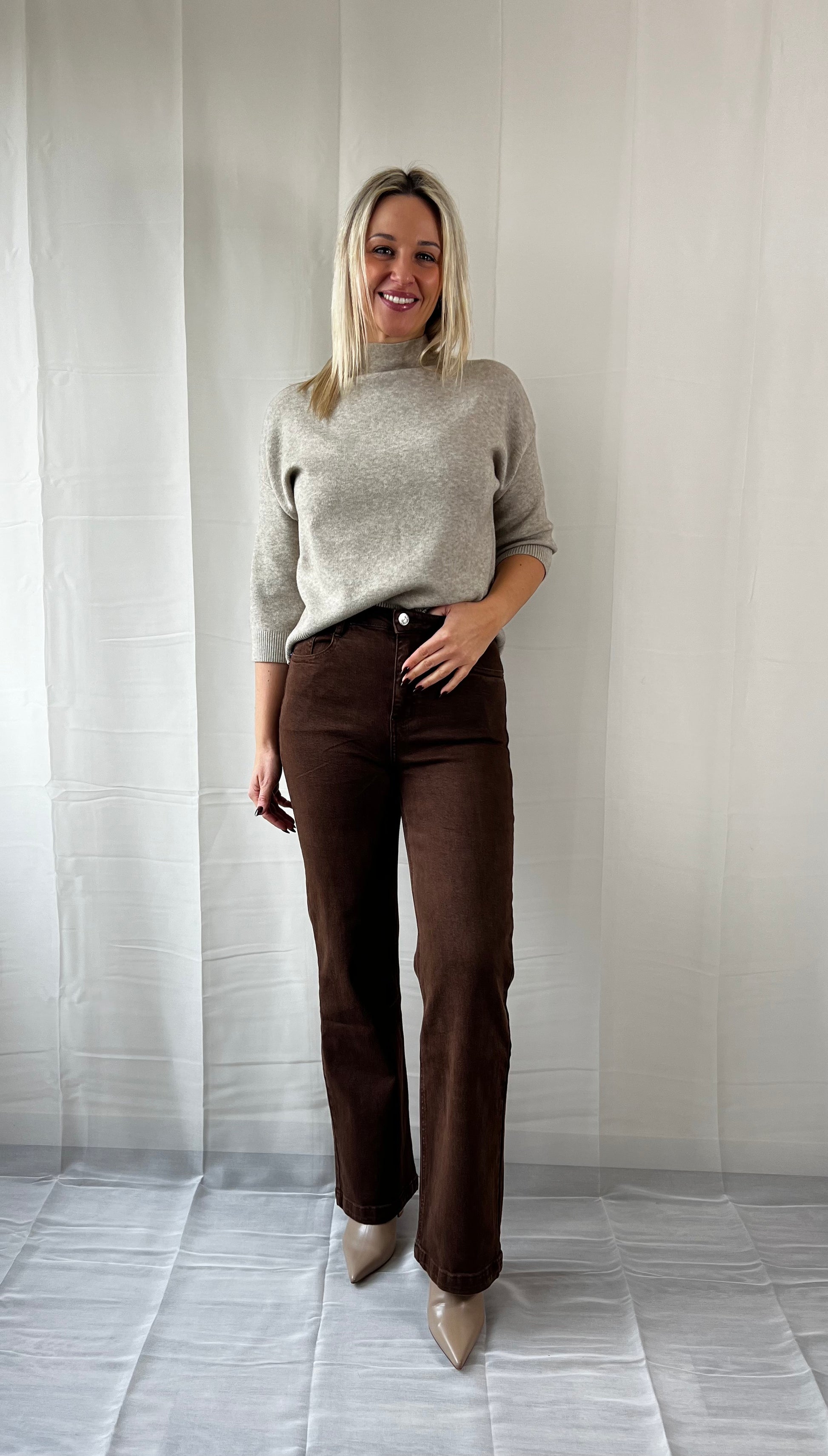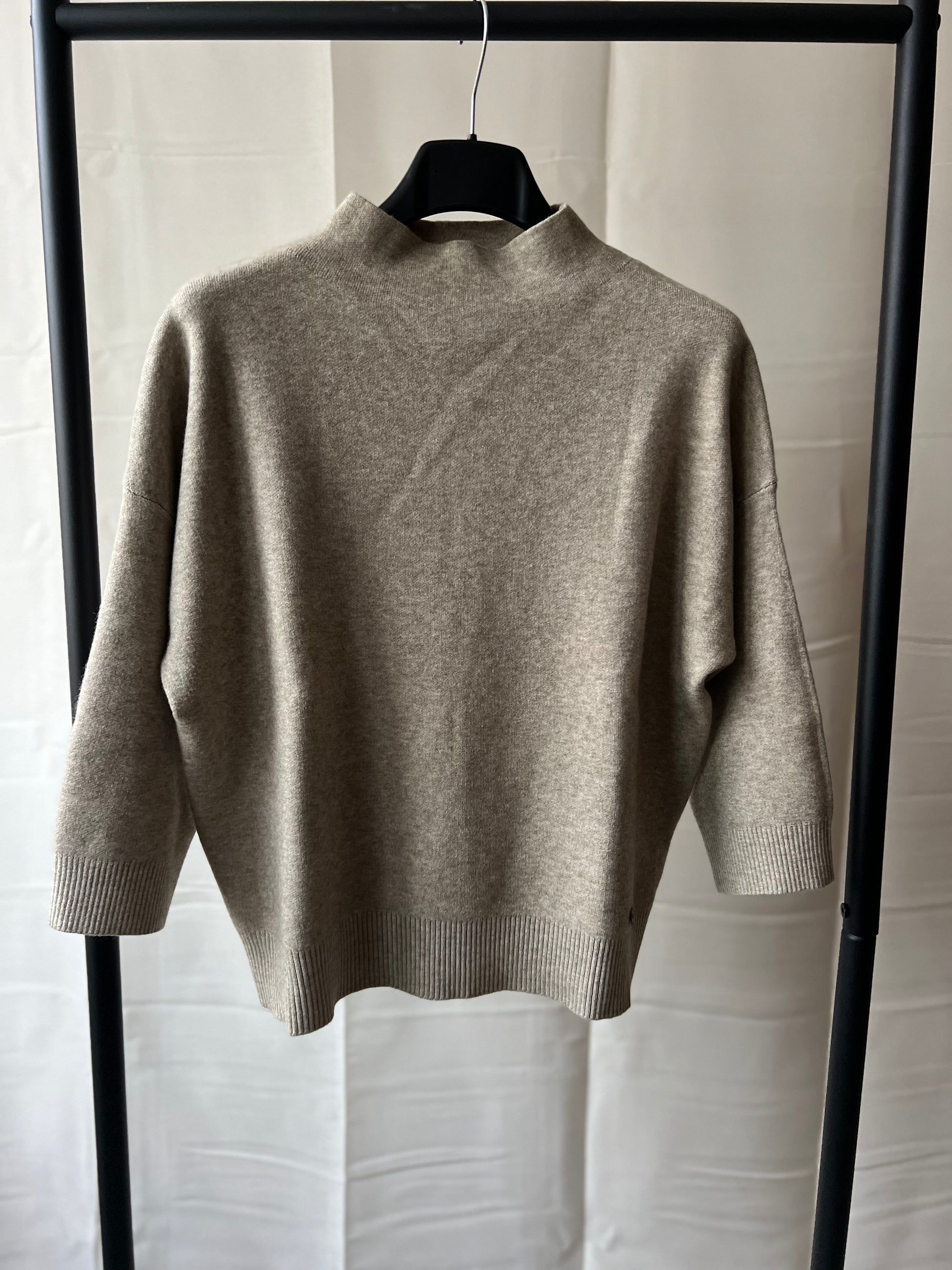 Neutral-toned knit sweater crafted in a sophisticated taupe shade. This versatile layering piece delivers timeless appeal with a refined aesthetic, making it an essential addition to any wardrobe seeking understated elegance and enduring style.